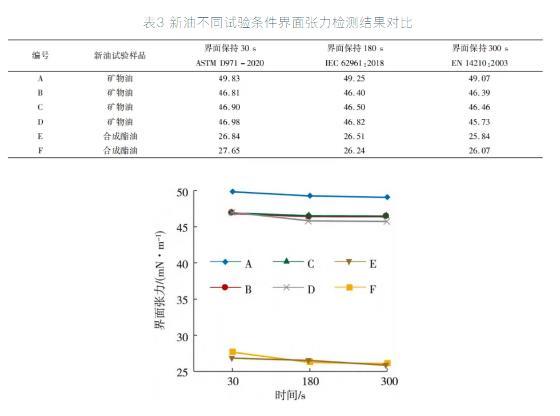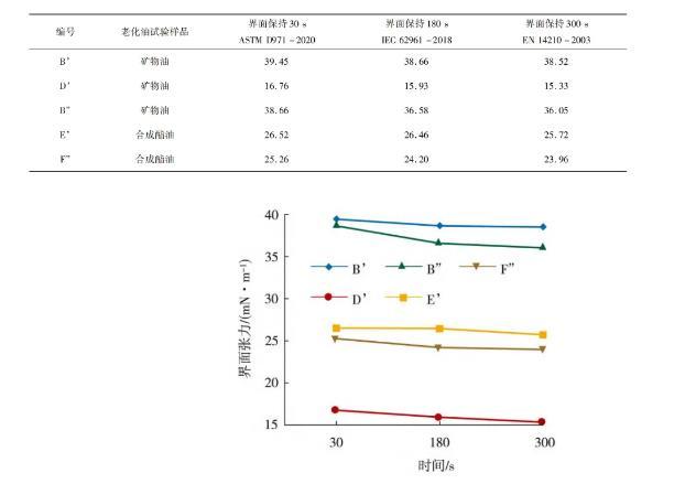 IEC62961:2018方法介于ASTMD971方法和EN14210方法之間,在界面形成180s時(shí)測(cè)量界面張力更加符合實(shí)際,同時(shí)測(cè)量時(shí)間對(duì)測(cè)量結(jié)果影響較小。從圖3和圖4也可以看出,老化油的界面張力隨時(shí)間變化較為明顯,主要表現(xiàn)在界面張力曲線從30s到180s的變化斜率較大,而在界面形成的180s時(shí)測(cè)量界面張力數(shù)值與300s的測(cè)量數(shù)據(jù)很接近,可以提供一個(gè)較為真實(shí)的界面張力值,并且檢測(cè)時(shí)間相對(duì)較短。