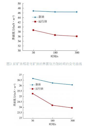 圖3新礦油和老化礦油的界面張力隨時(shí)間的變化曲線