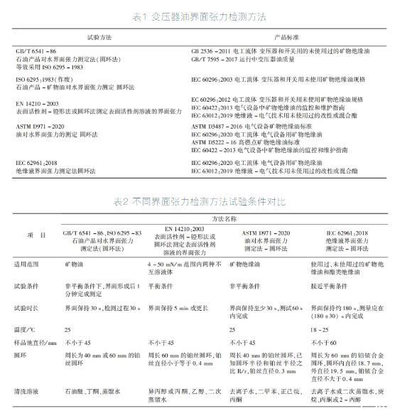 方法:不同產(chǎn)品標(biāo)準(zhǔn)所采用的界面張力檢測(cè)方法不同,具體如表1和2所示。可以看出,各方法的測(cè)量原理相同,測(cè)定絕緣油的界面張力的方法大都采用的是圓環(huán)法,主要區(qū)別就是界面形成后即非平衡條件、接近平衡條件及平衡條件下測(cè)試的保持時(shí)間不同。