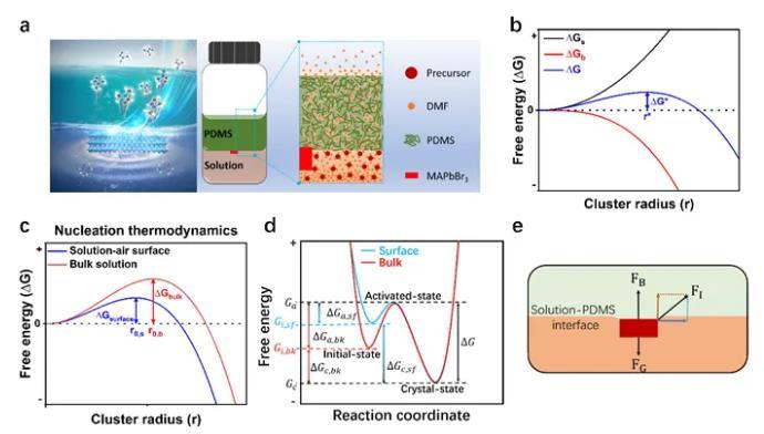 圖1. MAPbBr3鈣鈦礦結晶與晶體生長。(a) PDMS輔助結晶原理圖;(b) 形核半徑與自由能的關系;(c) 溶液的表面和內部的形核半徑的比較;(d)生長過程中自由能變化圖解;(e)界面懸浮生長的力學圖解。