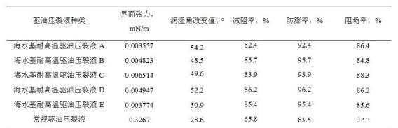 mN/m,潤濕角改變值≥40°,減阻率≥70%,防膨率≥90%,阻垢率≥80%。從表2中數(shù)據(jù)可以看出,新研究的海水基耐高溫驅(qū)油壓裂液,在實(shí)驗溫度180℃條件下,各項指標(biāo)均達(dá)到海上油田的要求;在相同條件下,其界面張力值、潤濕角改變值、減阻率、防膨率、阻垢率均優(yōu)于常規(guī)驅(qū)油壓裂液產(chǎn)品。