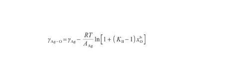 由式(12)和(13)可以看出,Butler方程計算較為復(fù)雜??紤]液態(tài)氧的表面張力很小[14],可以認(rèn)為γO≈0。另外,由于Ag-O系中O原子數(shù)遠(yuǎn)小于Ag原子數(shù)[29],可以將Ag-O溶體視為理想溶體。此時,GE,b=G=G=0。根據(jù)文獻(xiàn)[18],當(dāng)式(12)所示的Butler方程用于描述理想溶液時,通過假設(shè)系統(tǒng)內(nèi)兩組分具有相等的摩爾表面積,可以得到改進(jìn)的Butler方程。這個改進(jìn)的Bulter方程能夠推導(dǎo)出Gibbs吸附方程和Langmuir方程,被認(rèn)為是表面張力和溶液吸附的根本方程。因此,令A(yù)Ag=AO,將式(12)變換為: