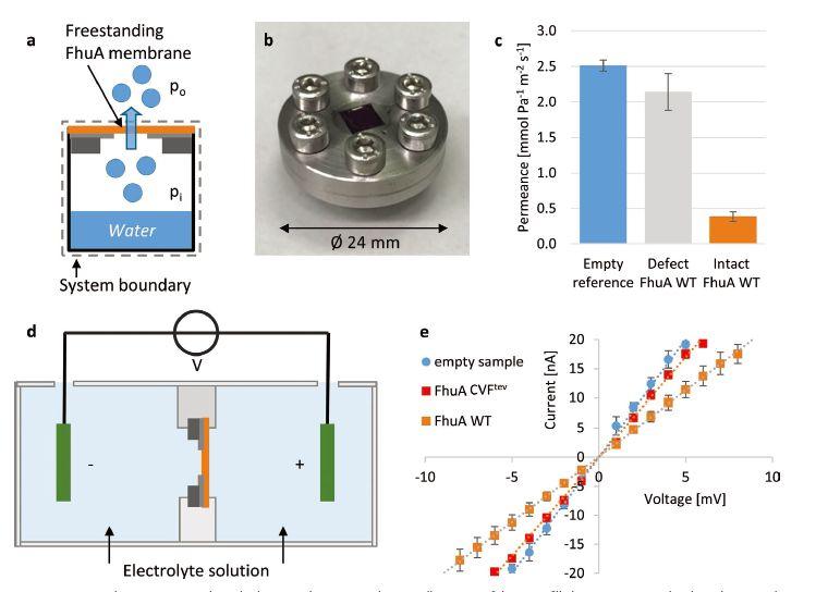 圖5、通過FhuA膜的水和離子滲透。a)覆蓋有氮化硅膜窗口的充水容器的示意圖,其用于測量FhuA WT膜的水滲透。由從杯內到杯外的水蒸氣壓差驅動(pi-p0)(a)中所示的杯子的照片。c)FhuA WT膜的水滲透性為3.87×104 mol Pa-1 m?2 s-1(空參考25.13×104 mol Pa-1 m?2 s-1誤差條表示至少三個樣品的平均值的標準誤差。d)用于測量FhuA膜的離子滲透性的實驗裝置的示意圖。離子在電極之間擴散的唯一方式是滲透氮化硅膜窗口中的孔頂部的FhuA膜。e)在磷酸鹽緩沖液(10×10?3 m NaCl,10×10?3 m恒定斜率對應于4.0mS(空參比)、3.4mS(FhuA?CVF)、3.4mS(FhuA?CVF)和3.4mS(FhuA?CVF)的電極之間的恒定電導.