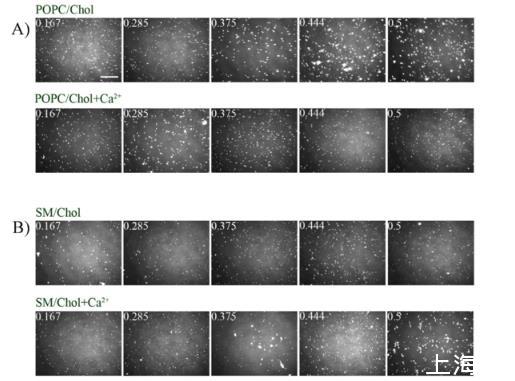 圖3、(A)POPC/Chol單層膜,(B)SM/Chol單層膜的BAM圖像(Chol摩爾比為0.167;0.285;0.375;0.444和0.5),存在或不存在Ca2+,在35±2°C。白色比例尺=100?m。