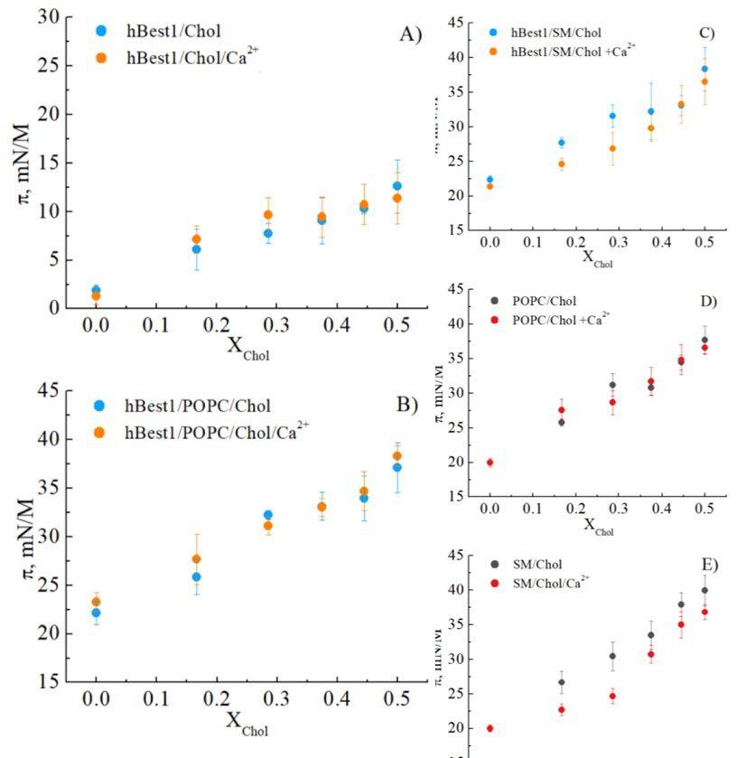 圖1.膽固醇對(A)hBest1、(B)hBest1/POPC、(C)hBest1/SM、(D)POPC和(E)SM單分子層的凝聚效應(Chol的摩爾分數(shù)為0.167;0.285;0.375;0.444和0.5)在存在或不存在Ca 2+的情況下,在35±2°C。數(shù)據(jù)表示為平均值±SE,n=7。