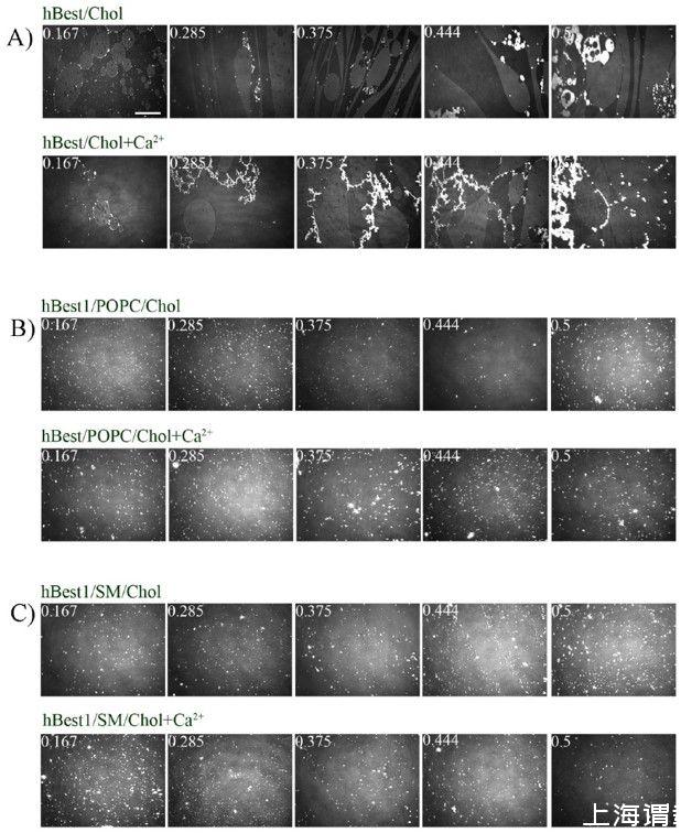 圖2.(A)hBest1/Chol單分子層、(B)hBest1/POPC/Chol(C)hBest1/SM/Chol單分子層的BAM圖像(摩爾分數(shù)為Chol 0.167;0.285;0.375;0.444和0.5)Ca 2+的存在與否,在35±2°C。白色比例尺=100μm。