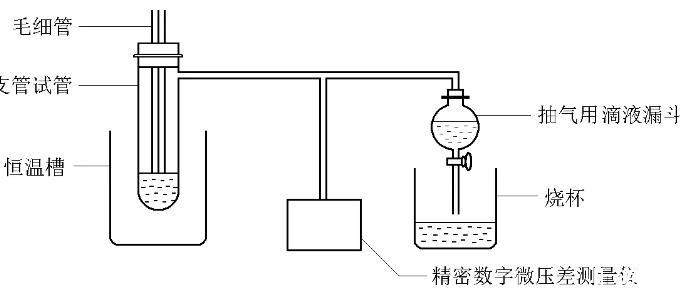 儀器:AF-02型數(shù)字式微壓測(cè)量?jī)x,數(shù)控恒溫槽,5mL和10mL移液管各一支,堿式滴定管1支,50mL容量瓶9個(gè),樣品管1個(gè),毛細(xì)管1個(gè),抽氣瓶1個(gè),錐形瓶1個(gè),玻璃漏斗1個(gè)。