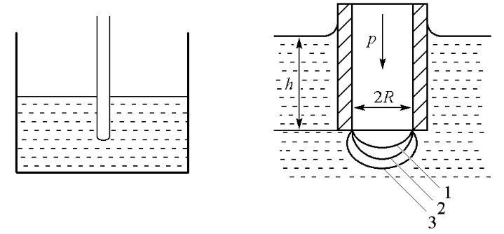 由于最大氣泡壓力法的器材易得,且易于學(xué)生理解表面張力的原理,因而一直是教學(xué)中測(cè)定液體表面張力的一種常用方法[2]。如圖1所示,測(cè)定時(shí)將一根毛細(xì)管插入待測(cè)液體內(nèi)部,從管中緩慢地通入惰性氣體對(duì)其內(nèi)的液體施以壓力,使管端形成氣泡逸出。當(dāng)所用的毛細(xì)管管徑較小時(shí),可以假定所產(chǎn)生的氣泡是球面的一部分;但是在氣泡生成及發(fā)展過(guò)程中,氣泡的曲率半徑會(huì)隨惰性氣體的壓力變化而改變。當(dāng)氣泡的形狀恰為半球形時(shí),氣泡的曲率半徑最小(即毛細(xì)管半徑R),此時(shí)根據(jù)Laplace方程,管內(nèi)外壓差達(dá)最大,其值Δpmax=p-ρgh可由差壓計(jì)測(cè)量得到[3]。利用最大壓差和毛細(xì)管半徑即可計(jì)算表面張力σ: