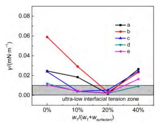 從圖3可見,在所考察的五個(gè)油水體系中,界面張力先隨保護(hù)劑T的比例增加而下降。當(dāng)保護(hù)劑加入量達(dá)到10%-20%(摩爾分?jǐn)?shù))時(shí),即達(dá)到最低界面張力。當(dāng)進(jìn)一步加入非離子保護(hù)劑時(shí),界面張力值反而有所上升。這是因?yàn)楫?dāng)較少的非離子保護(hù)劑加入時(shí),可有效控制陰陽離子表面活性劑混合體系的沉淀,使混合體系的表面活性劑有效濃度增加。而當(dāng)保護(hù)劑T比例進(jìn)一步增加時(shí),陰陽離子表面活性劑的實(shí)際總量相應(yīng)減少,使得界面上陰陽離子表面活性劑的實(shí)際含量降低。上述實(shí)驗(yàn)結(jié)果充分說明了保護(hù)劑的具體作用,即保護(hù)劑起到的作用是控制了實(shí)際體系中鈣鎂離子對(duì)陰陽離子表面活性劑的不利影響,從而獲得了合理的油水兩相表面活性劑濃度的平衡,但是其本身并沒有對(duì)超低界面張力的獲得有實(shí)質(zhì)性貢獻(xiàn),是陰陽離子表面活性劑在有效地降低實(shí)際油水界面張力。