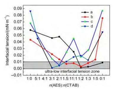 按照陰陽離子表面活性劑:非離子保護(hù)劑摩爾比為4:1的比例,在總表面活性劑含量不變的情況下,變化AES/烷基季銨鹽CTAB的混合比例進(jìn)行研究。實(shí)驗(yàn)結(jié)果顯示,陰陽離子表面活性劑復(fù)配體系的沉淀得到很好的控制,在七中、石西、陸九、莫北四個(gè)實(shí)際油水體系中獲得了較大范圍的超低界面張力區(qū)間(圖1)。從而證明了我們采用的三組分策略可有效幫助陰陽離子表面活性劑復(fù)配體系實(shí)現(xiàn)超低界面張力。