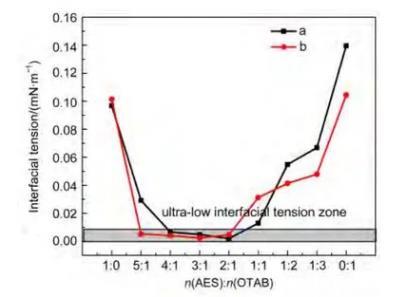 AES/烷基季銨鹽CTAB摩爾比為1:1的混合體系的β參數(shù)計(jì)算結(jié)果為~20.4,表明AES與烷基季銨鹽CTAB親水基間具有極強(qiáng)的吸引作用。值得注意的是,該體系還具有很高的溫度穩(wěn)定性,在55°C時(shí)仍能保持30 mN·m-1以下的表面張力。這說明在較高溫度時(shí)該體系的分子排列仍然較為緊密,這和陰陽離子表面活性劑體系中分子因靜電吸引造成的緊密排列是密切相關(guān)的。考慮到油水界面張力同樣與界面上的分子排列有關(guān),因此有可能在溫度較高時(shí)實(shí)現(xiàn)超低界面張力。