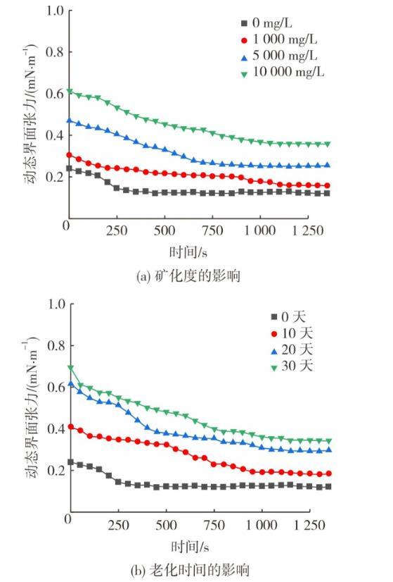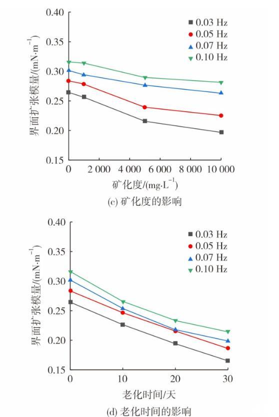 圖3為油藏條件對(duì)動(dòng)態(tài)界面張力及界面擴(kuò)張模量的影響。采用不同礦化度模擬水配制體系(0.06%(w)凍膠分散體+0.10%(w)降黏劑),在50℃老化10天。圖3(a)和圖3(c)呈現(xiàn)了礦化度對(duì)體系界面流變性質(zhì)的影響。從圖3可知,隨著礦化度的提高,老化后體系的動(dòng)態(tài)界面張力穩(wěn)定值從0.127 mN/m增至0.356 mN/m。降黏劑帶有磺酸鹽基團(tuán),有較強(qiáng)的耐溫耐鹽能力,因此界面張力的提升幅度有限。此外,體系的界面擴(kuò)張模量隨礦化度的增大而減低,這是由于地層水陽(yáng)離子會(huì)對(duì)凍膠分散體之間的擴(kuò)散雙電層產(chǎn)生壓縮作用,減小凍膠分散體表面負(fù)電量,降低其分散穩(wěn)定性,體系黏度隨之下降。