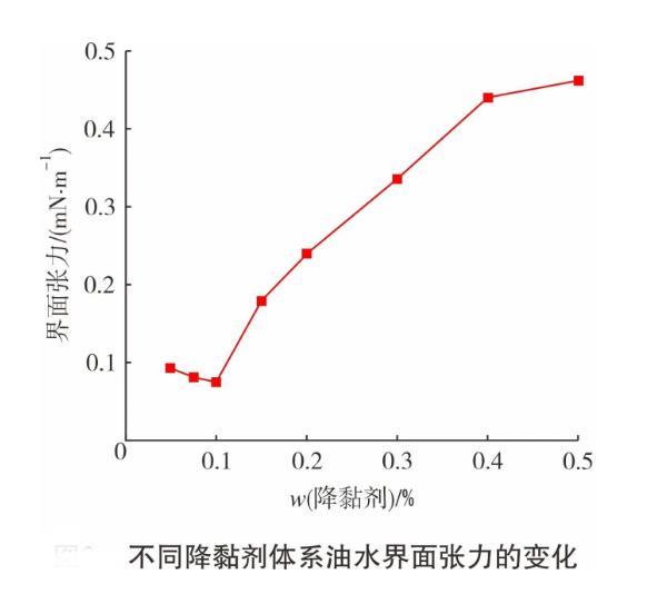 圖1為在不同降黏劑質(zhì)量分?jǐn)?shù)下,體系油水界面張力的變化情況。從圖1可知,在降黏劑質(zhì)量分?jǐn)?shù)為0.05%~0.10%時(shí),界面張力隨質(zhì)量分?jǐn)?shù)增加而降低。當(dāng)降黏劑質(zhì)量分?jǐn)?shù)超過0.10%時(shí),界面張力開始上升。在低質(zhì)量分?jǐn)?shù)下,降黏劑在油水界面上形成吸附膜,降低界面張力。當(dāng)降黏劑質(zhì)量分?jǐn)?shù)超過臨界膠束含量后,降黏劑在界面聚集數(shù)量增加,吸附層排布更不規(guī)則,導(dǎo)致界面張力升高。