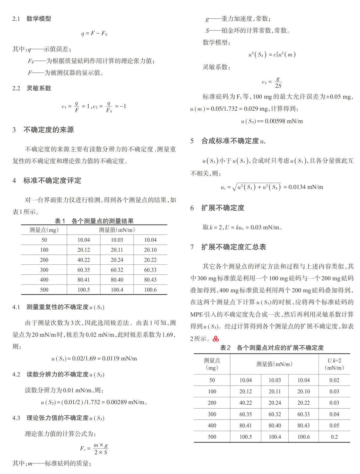 [u(S2)=(0.01/2)/1.732=0.00289]mN/m。