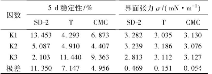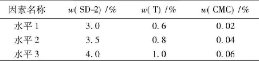 乳化劑SD-2,締合型增稠劑T和羧甲基纖維鈉等是CA砂漿陰離子乳化瀝青中最關鍵的3種組分,對乳化瀝青的性能起著決定性的影響。為了比較對油水界面張力和乳化瀝青貯存穩定性的影響,采用L9(34)正交試驗的方法進行優化設計,因素水平見表1。