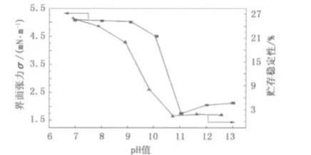 圖2皂液pH值對界面張力和貯存穩定性界面張力的影響