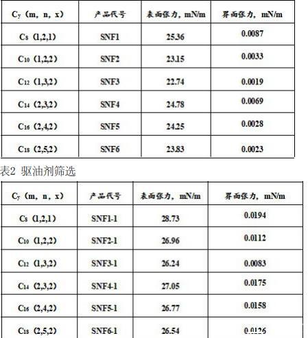 制得的驅、滲一體化驅油劑(SNF1至SNF6)的表面張力和界面張力,測試條件:60℃、5000rpm,濃度均為0.2%,測試結果見表1。表1中,y是驅、滲一體化驅油劑的親油碳鏈主鏈長度,m是對苯乙烯磺酸鈉的反應系數,n是丙烯酰胺的反應系數,x是氟碳陽離子疏水單體的反應系數。