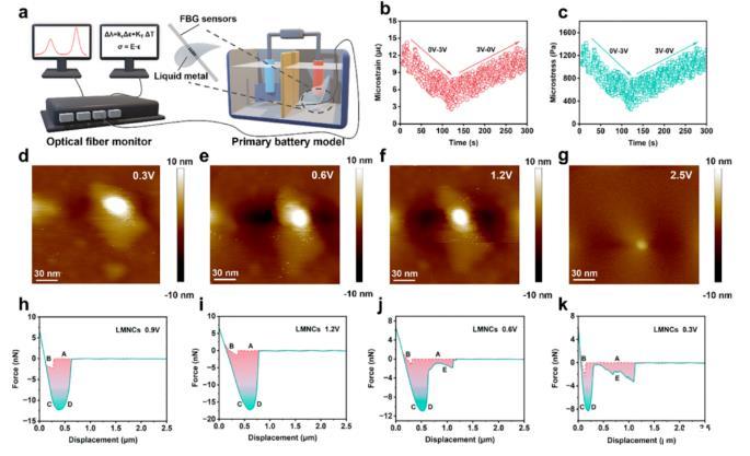 圖2電極材料的應力-電化學測試。(a)光纖布拉格光柵傳感器(FBG)在液態(tài)金屬中的應力-電化學測試示意圖。(b,c)FBG在液態(tài)金屬中的應力響應圖。(d-g)不同電壓下軟包電池中LMNCs的AFM測試圖。(h-k)不同電壓下的LMNCs力-位移曲線圖。