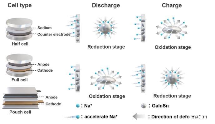 該工作闡述了液態(tài)金屬界面張力與電極電勢之間的關系,并闡明了電極電勢對Na+電化學傳輸速率的影響(圖1)。在還原反應過程中,電極電勢降低,液態(tài)金屬的界面張力加快了Na+向內的傳輸速率。在氧化反應過程中,電極電勢增加,液態(tài)金屬表面電荷密度增大,界面張力下降,加快了Na+向外的傳輸速率。在此基礎上,為了加強液態(tài)金屬結構穩(wěn)定性,構筑液態(tài)金屬核殼包覆結構(LMNCs),其自調節(jié)的界面張力有效改善了Na+傳輸動力學過程。