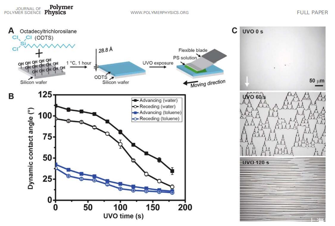 圖 1 (A) 制備具有可調(diào)表面能的基材然后應(yīng)用流涂工藝的示意圖。 (B) 動(dòng)態(tài) 接觸角包括作為 UVO 時(shí)間函數(shù)的基材的前進(jìn)(實(shí)心數(shù)據(jù)點(diǎn))和后退(開(kāi)放數(shù)據(jù)點(diǎn))。 使用水(黑色數(shù)據(jù)點(diǎn))和甲苯(藍(lán)色數(shù)據(jù)點(diǎn))的液體。 誤差棒表示三個(gè)的標(biāo)準(zhǔn)偏差 獨(dú)立樣本。 (C) 在具有可調(diào)表面能的基材上制造的結(jié)構(gòu),從無(wú)沉積、超支化結(jié)構(gòu)到通過(guò)流涂的水平線(xiàn)。 此處使用的其他流涂參數(shù)是初始濃度 co,如 0.5 mg/mL,停止時(shí)間 t 為 100 ms,設(shè)置距離 d 為 5 lm。