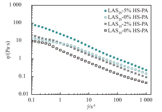 圖7為不同配方洗滌劑的表觀黏度隨剪切速率變化曲線,隨著剪切速率不斷增加,4個樣品的表觀黏度均逐漸減小,表現(xiàn)出剪切變稀的非牛頓流體行為。在恒定剪切速率下,體系中加入HS-PA將提高洗滌劑的黏度。結(jié)合偏光顯微鏡圖像可知,HS-PA的加入使得分子空間堆積構(gòu)型發(fā)生改變,體系中出現(xiàn)更多的球形層狀液晶,液晶結(jié)構(gòu)越多越完整,則說明其形成的聚集體中,分子排布越緊密且越有序,層間發(fā)生滑動時越困難,宏觀表現(xiàn)為黏度越大。當(dāng)無HS-PA影響時,在相同剪切速率下,活性物質(zhì)量分?jǐn)?shù)越高,黏度越大。這可能是因為活性物質(zhì)量分?jǐn)?shù)越大,表面活性劑分子之間作用力越強(qiáng),分子鏈發(fā)生相對運(yùn)動時的阻礙效果越明顯,黏度則越大。