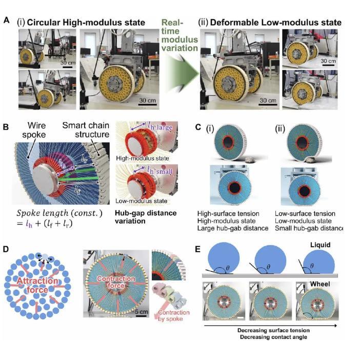 這是一個受液滴表面張力啟發(fā)的可變剛度輪。在液滴中,隨著最外層液體分子的內聚力的增加,將液體分子向內拉的凈力也增加。這導致高表面張力,導致液滴從引力引起的扭曲形狀恢復為圓形。同樣,車輪的形狀和剛度是通過改變最外層智能鏈塊的牽引力來控制的。隨著連接到每個鏈塊的鋼絲輻條張力的增加,車輪特性反映了一般圓剛輪的特性,這在正常平坦地面上的高速運動中具有優(yōu)勢。相反,隨著線輻條張力的減小,車輪的模量減小,并且根據(jù)障礙物的形狀,車輪容易變形。這使得輪子適合克服障礙物,而不需要復雜的控制或傳感系統(tǒng)。在此機理的基礎上,將輪子應用于重達120 kg的兩輪輪椅系統(tǒng),實時實現(xiàn)了輪椅在室外環(huán)境中駕駛時,圓形高模量狀態(tài)和可變形低模量狀態(tài)的狀態(tài)轉換。