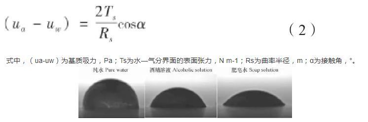 由上式可以看出,基質(zhì)吸力的大小與表面張力、接觸角和曲率半徑有關(guān)。其中,基質(zhì)吸力的大小與表面張力成正比,與彎液面曲率半徑成反比。因此,表面張力和曲率半徑的變化均會導(dǎo)致基質(zhì)吸力的改變。在環(huán)境溫度為25℃時,通過JC2000型接觸角測量儀對三種試樣的孔隙液體進行接觸角測量。得到三種不同表面張力液滴的幾何形態(tài)圖如圖4所示,測量可得純水、酒精溶液和肥皂水對應(yīng)的接觸角分別為85°、65°和42°,而在25℃環(huán)境下,純水、20%酒精溶液、2 g L-1肥皂水的表面張力系數(shù)分別為:7.1×10-2N m-1、4.1×10-2N m-1、2.9×10-2N m-1。表面張力是決定彎液面形狀的主要因素之一,會影響曲率半徑和接觸角的大小。很顯然,表面張力大的液體接觸角變大,曲率半徑變小。圖4中水滴表面張力大于酒精溶液,但形成的彎液面半徑卻要小于酒精溶液,同樣的,酒精溶液形成的彎液面半徑又小于肥皂水。曲率半徑越小,土體中的基質(zhì)吸力越大。孔隙水表面張力會對彎液面的曲率半徑產(chǎn)生改變從而對基質(zhì)吸力產(chǎn)生影響,最終影響土壤的收縮開裂。