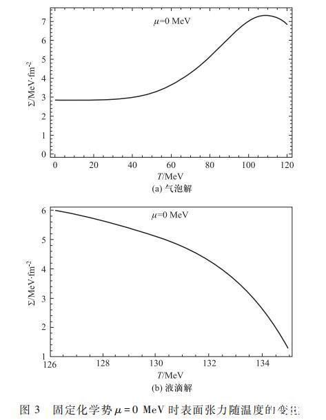 進一步,本文對式(12)、(16)進行了數值求解,得到了氣泡解和液滴解的表面張力及臨界半徑在μ=0 MeV時隨溫度變化的曲線,如圖3和4.式(10)是非線性方程,難以解析求解。以往研究者的文章中曾利用薄壁近似進行解析求解進而得到氣泡表面張力隨溫度減小而單調減小的結果。但本文的數值結果圖3(a)表明,在溫度從臨界溫度開始減小時,表面張力會先增加。當溫度到達T=109 MeV附近時,表面張力達最大值,然后再隨溫度減小而單調減小。而我們知道嚴格來說薄壁近似只在臨界溫度處適用,這里表面張力的非單調變化表明在偏離臨界溫度時,薄壁近似結果是會明顯偏離嚴格數值計算結果的。這一結果與以往研究者結果是一致的。