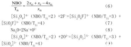 熔體表面張力與熔渣結(jié)構(gòu)的聚合程度密切相關(guān)。連鑄結(jié)晶器保護(hù)渣屬于硅酸鹽,硅酸鹽熔體中含有不同聚合程度的硅氧陰離子團(tuán)。熔渣結(jié)構(gòu)的聚合程度用符號(hào)“NBO/TSi”表示,其計(jì)算公式如式(4)所示。NBO/TSi值越小,說明熔體聚合程度越高。將預(yù)熔渣和靜滴法測(cè)定后的渣樣成分分別帶入到式(6)中,計(jì)算結(jié)果如表2所示。從表中可以看出,靜滴法測(cè)定后渣樣的NBO/TSi值小于預(yù)熔渣的NBO/TSi值,說明靜滴法測(cè)定后的渣樣熔體結(jié)構(gòu)聚合程度高于預(yù)熔渣熔體結(jié)構(gòu)聚合程度。這是由于F-能降低熔渣結(jié)構(gòu)的聚合程度,將高聚合程度的硅氧陰離子團(tuán)逐漸解聚成低聚合程度的硅氧陰離子,同時(shí)Na2O電解出O2-,O2-的出現(xiàn)亦可降低熔體的聚合程度,反應(yīng)式見(7)~(9):
