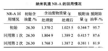 將已處理過含油廢物的納米乳液分離后進行收集,然后進行重復處理新的含油廢物。納米乳液和含油廢物按劑固比2∶1混合后,用磁力攪拌器在1 000 r/min下攪拌20 min,實驗溫度為25℃,測量含油廢物經不同回用次數的納米乳液脫附處理前后的含油量,計算脫附除油率,測試結果見下表。