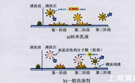 納米乳液是由油-水-表面活性劑-助表面活性劑組成的,具有熱力學穩定性和各向同性的多組分分散體系。納米乳液中分散相質點的半徑在10~100 nm之間,納米乳液粒徑小,表界面張力低,使其吉布斯自由能最低,納米乳液與常規表面活性劑除油機理相比(見圖1),脫油效果更徹底。