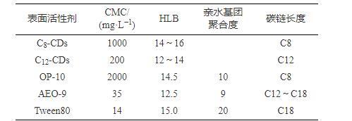 硅酸鈉(模數2.51,50.1°Bé),聚氧乙烯型表面活性劑OP-10、AEO-9、Tween 80(AR)。5種不同表面活性劑的理化性質和化學結構式見表1。其中,CMC為表面活性劑在水中的臨界膠束濃度,HLB為表面活性劑的親水親油平衡值。