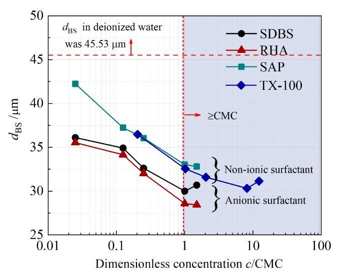 在不更新氣泡表面和表面活性劑分子抑制凝聚的共同作用下產生了粒徑更小的微納米氣泡。表面活性劑濃度大于CMC值的溶液中的微納米氣泡的粒徑小于表面活性劑濃度小于CMC的溶液中的。該現象主要是因為當表面活性劑濃度小于CMC值時,表面活性劑分子不足以完全覆蓋氣泡表面。另外,如圖1所示,隨著濃度增加,微納米氣泡的粒徑降低,當c/CMC值大于1時,溶液的表面張力達到了穩定值,但微納米氣泡的粒徑持續減小。