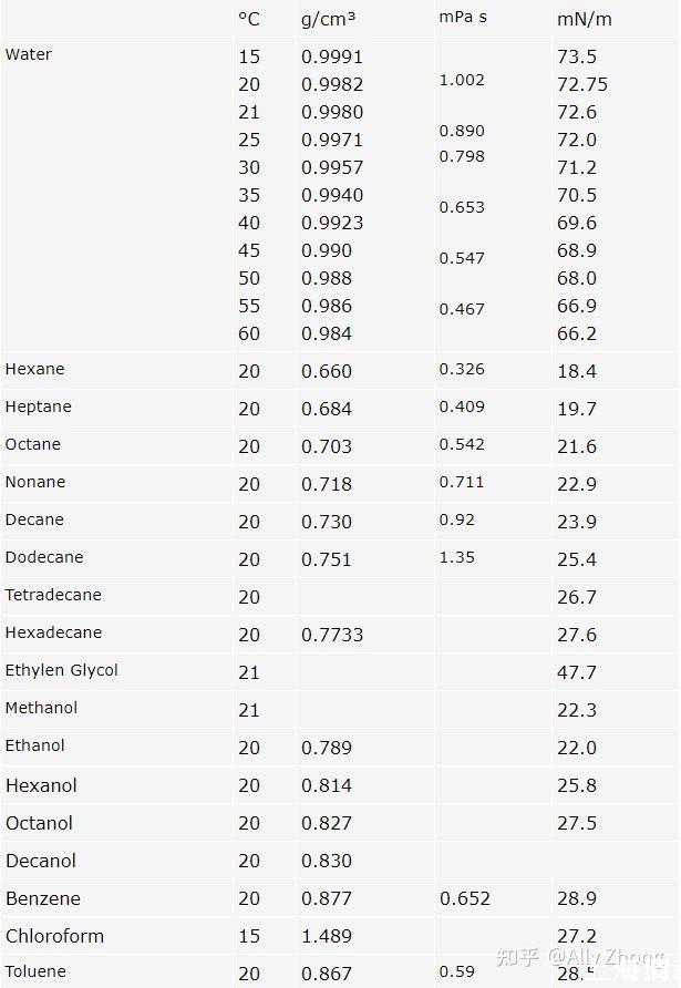 只有少數(shù)樣品可用于此類試驗(yàn)測(cè)量。下表提供了一些此類液體的重要數(shù)據(jù)。這些數(shù)值由不同的作者和方法確定,可以作為標(biāo)準(zhǔn)。