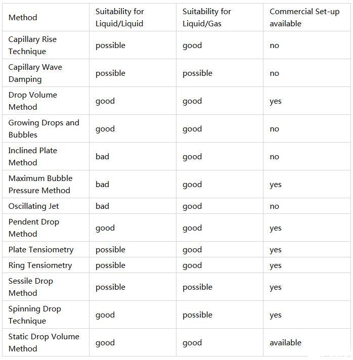 為了克服這個(gè)問題,Joos提出了一個(gè)理論,將動(dòng)態(tài)方法的數(shù)據(jù)減少到所謂的界面有效壽命,相當(dāng)于靜態(tài)界面達(dá)到吸附狀態(tài)所需的時(shí)間。這樣就可以直接比較所有實(shí)驗(yàn)技術(shù)的測(cè)量結(jié)果。每種方法都有優(yōu)點(diǎn)和缺點(diǎn)。