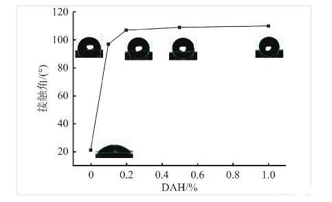 將巖心切片,使用800號金相砂紙將巖心片充分打磨,在室溫下將巖心片放入不同濃度的防水鎖劑DAH溶液,浸泡10 h,取出后在室溫下晾干,使用OCA-25型光學接觸角測定儀測定蒸餾水在巖心片表面的接觸角,結果見圖4。