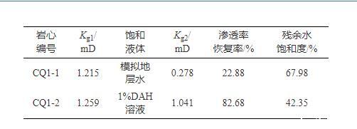 將一塊巖心截為兩塊,測量兩塊巖心干態下氣測滲透率Kg1,之后將兩塊巖心分別飽和模擬地層水和DAH溶液,使用氮氣在相同壓力下將兩塊巖心驅替至平衡,測量巖心氣測滲透率Kg2及殘余水飽和度,計算氣驅后滲透率與干態下滲透率比值,即為巖心滲透率恢復率。如表2所示,使用模擬地層水飽和巖心后,滲透率恢復率僅有22.88%,水鎖損害嚴重,而使用1%DAH溶液飽和巖心后,滲透率恢復率高達82.68%,水鎖損害程度大幅降低,殘余水飽和度更低,液相返排也更容易。
