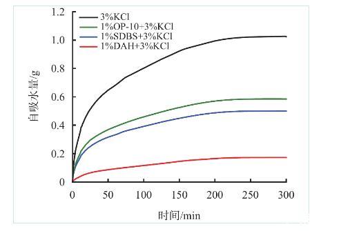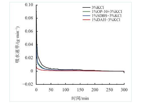 由圖5可以看出,水相會在毛細管力的作用下自吸入巖心,初始階段巖心的自吸水量較大,經過200 min后達到平衡,自吸水量不再增加;加入DAH后,巖心自吸水量下降83.1%,且相較于常用防水鎖劑OP-10、SDBS效果更佳。圖6同樣表明,加入DAH后,巖心自吸水速率大幅降低,整個自吸過程中速率緩慢。上述實驗表明,DAH可以減少因毛細管力被吸入地層的水相,從而降低水鎖損害發生的風險。