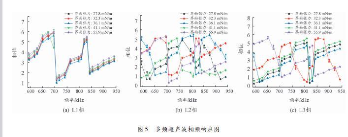 這是由于2個超聲波接收器所接收到的三相超聲波信號傳播所經過的路徑和周期不同,導致對應的相角不同。L2和L3的相頻響應圖變化趨勢無相對明顯的變化規律,但超聲波信號在傳播過程中由于發生超聲弛豫、吸收、散射等現象導致相角的不同,其信息包含在相位頻譜中,對于分析變壓器油界面張力具有重要作用。