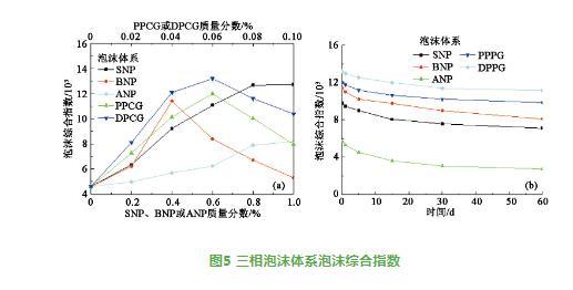 三相泡沫體系泡沫綜合指數見圖5。由圖5(a)可知,隨顆粒質量分數增加,BNP、DPCG或PPCG三相泡沫體系的泡沫綜合指數先增加后降低,而SNP或ANP體系的泡沫綜合指數先快速增加,而后趨于平穩。DPCG三相泡沫體系的泡沫綜合指數極大值最大,SNP、BNP或PPCG三相泡沫體系的泡沫綜合指數低于DPCG的,而ANP的最小。由圖5(b)可知,隨時間增加,不同三相泡沫體系的泡沫綜合指數先快速降低,而后趨于平穩。DPCG或PPCG三相泡沫體系的泡沫綜合指數大于SNP、BNP或ANP體系的。DPCG或PPCG三相泡沫體系的泡沫綜合指數保留率達84%,其余體系保留率為50%~72%。