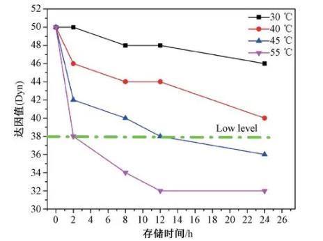 電暈后30℃存儲(chǔ)24 h后,耐候?qū)舆_(dá)因值為46 mN/m;當(dāng)升高存儲(chǔ)溫度至45℃時(shí),12 h后達(dá)因值即降低到38 mN/m;當(dāng)存儲(chǔ)溫度為55℃時(shí),達(dá)因值衰減更為迅速,2 h后達(dá)因值降為38 mN/m。耐候?qū)舆_(dá)因值隨著熟化溫度的升高,達(dá)因值衰減速率逐漸增大,因此若控制在38 mN/m以上,熟化溫度不能高于40℃,如圖3所示。
