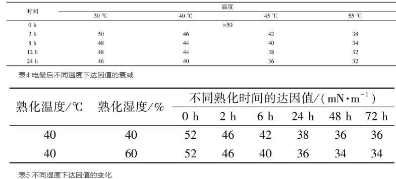 隨著保存時(shí)間的增長(zhǎng),背板的達(dá)因值也隨著逐漸降低。在低溫30℃下保存1d后達(dá)因值仍能達(dá)到48 mN/m,濕度越低,達(dá)因值下降越緩慢。溫度越高濕度越大,達(dá)因值下降越快。