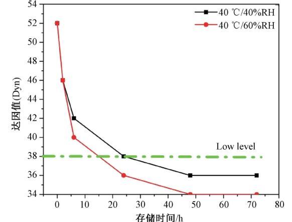 控制熟化溫度40℃,考察不同熟化濕度40%、60%下儲(chǔ)存不同時(shí)間耐候?qū)舆_(dá)因值的變化規(guī)律,如圖4所示。對(duì)比兩種濕度下達(dá)因值的下降趨勢(shì),60%的濕度環(huán)境達(dá)因值下降較快,在約24 h后達(dá)因值即已下降至38 mN/m以下。40%的濕度環(huán)境可維持38 mN/m的水平至少24 h。因此為保證耐候?qū)舆_(dá)因值不低于38 mN/m,需嚴(yán)格控制所處環(huán)境濕度小于40%RH。