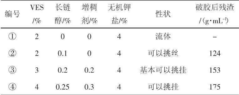 由表1可知④號配方當VES的含量為4%,長鏈醇為0.25%,無機鉀鹽含量為4%,增稠劑含量為0.3%時可以挑掛且殘渣量少,為最佳的配比。甜菜堿型陽離子清潔壓裂液的配方(見表2)。