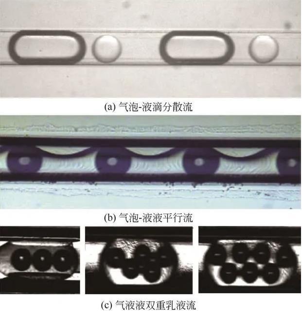 上述不同類型的微通道中所形成的流型也是學(xué)者們重點關(guān)注的內(nèi)容。在材料制備領(lǐng)域,流型是決定合成材料結(jié)構(gòu)的關(guān)鍵因素且直接影響著材料的相關(guān)性能;在過程強化領(lǐng)域,不同流型的強化效果差別較大,選擇并調(diào)控合適的流型是重中之重;在三相反應(yīng)中,流型可決定反應(yīng)的轉(zhuǎn)化率和選擇性,是需要優(yōu)化的重要參數(shù)之一。相比于兩相體系,三相體系由于流體間更為復(fù)雜的相互作用及更高的自由度而呈現(xiàn)出了更多的流動形態(tài)(圖3)。如Su等在十字形微通道中成功調(diào)控出液滴氣泡間隔排列的氣液液三相流。Xu等基于同軸環(huán)管微設(shè)備實現(xiàn)了氣液液雙乳液的可控制備,并揭示了流量和界面張力等因素對雙乳液結(jié)構(gòu)的影響。Wang等在雙T形通道內(nèi)通過調(diào)節(jié)操作條件可控制備了“水包油包氣”和“含有氣泡的液液平行流”兩種結(jié)構(gòu)。Rajesh等通過觀察液滴氣泡的形狀及位置關(guān)系定義了“氣柱-液柱”“彈狀-液滴”“液柱-雙氣彈”等流型。除了實驗手段Rajesh等借助VOF數(shù)值模擬方式從機理上揭示了氣液液三相流的流動規(guī)律,歸納了不同Ca和We范圍內(nèi)的流型特征和規(guī)律。此外,Yang等通過傳質(zhì)引發(fā)相分離的方法成功調(diào)控出氣液液雙乳液,該方法能實現(xiàn)更大范圍內(nèi)氣泡直徑尺寸和液膜厚度的調(diào)節(jié)。