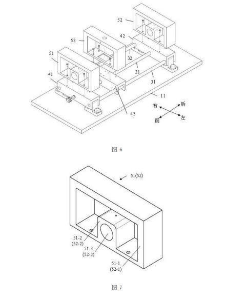 第一導桿31從前往后依次穿過第一左通孔41-1、第三左通孔43-1、以及第二左通孔42-1,第一導桿31的前端與第一左通孔41-1固定連接,第一導桿31的后端與第二左通孔42-1固定連接;第二導桿32從前往后依次穿過第一右通孔41-2、第三右通孔43-2、以及第二右通孔42-2,第二導桿32的前端與第一右通孔41-2固定連接,第二導桿32的后端與第二右通孔42-2固定連接。第一絲桿21從前往后依次穿過第一中間通孔41-3、第三中間通孔43-3、以及第二中間通孔42-3。