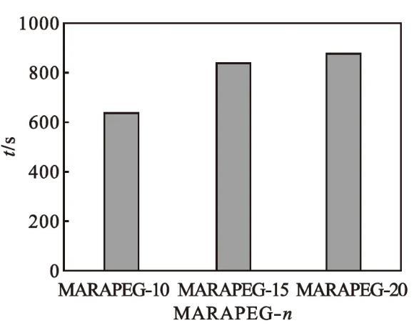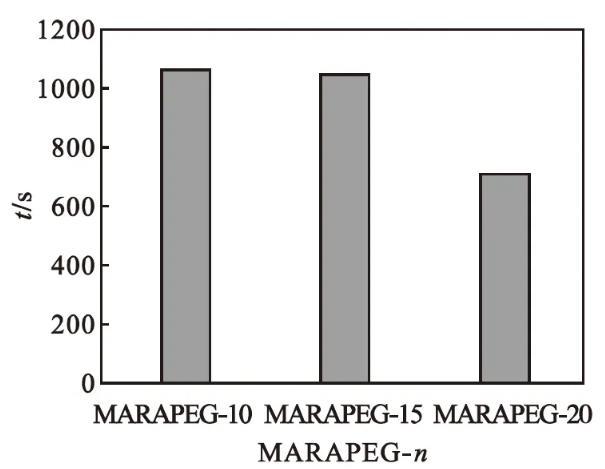 馬來(lái)酰蓖麻油酸聚乙二醇(n=10、15、20)酯的潤(rùn)濕性能如圖5所示。由圖5可知:產(chǎn)品的潤(rùn)濕時(shí)間隨著聚乙二醇聚合度的增大而增長(zhǎng)。氧乙基數(shù)增加,其親水性增強(qiáng),降低表面張力的能力減弱,潤(rùn)濕性能減弱。