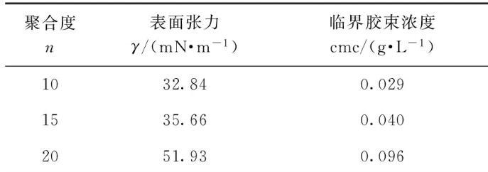 (2)聚乙二醇聚合度n=10、15、20時(shí),產(chǎn)品表面張力依次為32.84 mN/m、35.66 mN/m、51.93 mN/m,臨界膠束濃度為0.029 g/L、0.040 g/L、0.096 g/L,HLB為12.84、14.9、15.14,濁點(diǎn)為20℃、61℃、71℃,潤(rùn)濕時(shí)間為640 s、839 s、865 s,乳化時(shí)間為1063 s、1036 s、706 s.與傳統(tǒng)的表面活性劑相比,所合成的非離子雙子表面活性劑的表面張力和臨界膠束濃度均較小,乳化性能和潤(rùn)濕性能均較好,可作為水包油型乳化劑使用。