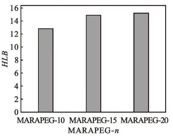 圖3馬來(lái)酰蓖麻油酸聚乙二醇(n=10、15、20)酯的HLB值
