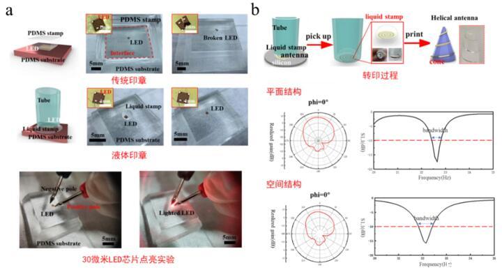 當液體印章與待轉印器件/單元結合時,液滴對器件進行包裹,進而實現保護器件的作用。相比于傳統彈性印章轉印方法,液體的流變特性充分發揮作用,使得薄膜器件更容易轉印到多種復雜的空間曲面上。通過對固-液界面粘附力的理論分析,提出了基于液滴印章的轉印技術,實現了柔性薄膜的高度精確可控轉印,并通過實驗證實了理論模型的正確性與該轉印方法的可行性。研究人員通過液體印章轉印方法,成功實現了30微米超薄LED芯片的轉印集成(圖2a為傳統印章和液滴印章轉印對超薄LED芯片轉印結果的對比)與錐螺旋微天線與異形曲面的轉印集成(圖2b)。此方法利用了表面張力和毛細作用,可以實現轉印期間印章-薄膜作用力的精確調控,進而能夠高效、高質量地完成超薄器件的轉印;利用二維制備工藝和轉印技術,實現了立體空間微結構和異形界面的集成,為曲面電子器件的設計與制備提供了一種新的方案。